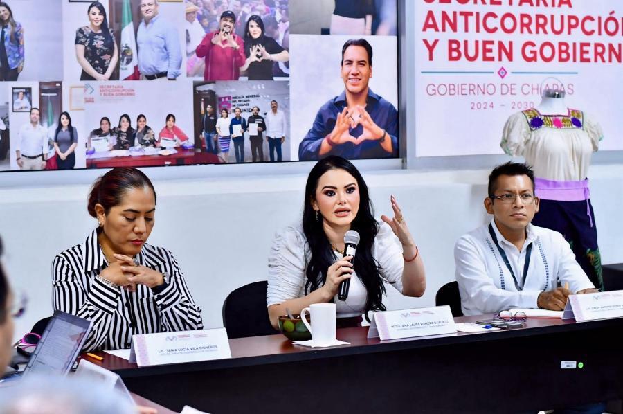 Tuxtla Gutiérrez, Chiapas.– La titular de la Secretaría Anticorrupción y Buen Gobierno (SAyBG), Ana Laura Romero Basurto, encabezó una reunión de trabajo con Subsecretarios y Directores de la dependencia, con el objetivo de dar seguimiento puntual a la verificación y uso eficiente de los recursos estatales mediante la plataforma Jaguar Evalúa.