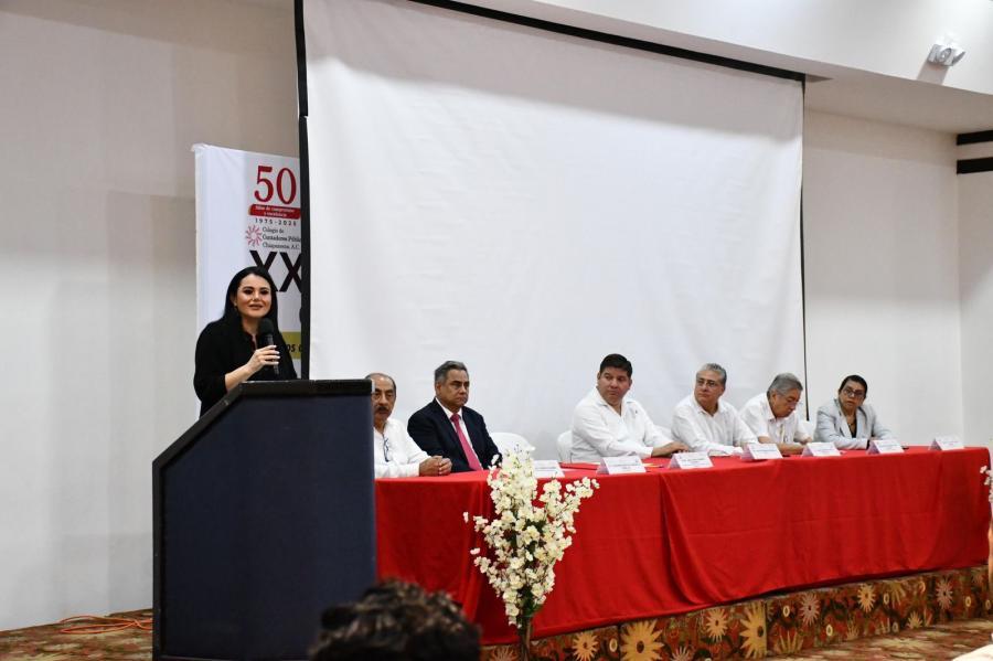 Tuxtla Gutiérrez, Chiapas.– La titular de la Secretaría Anticorrupción y Buen Gobierno, Mtra. Ana Laura Romero Basurto, participó como invitada de honor en la XXXIX Semana de la Contaduría Pública, celebrada bajo el lema “50 años de compromiso y excelencia”.