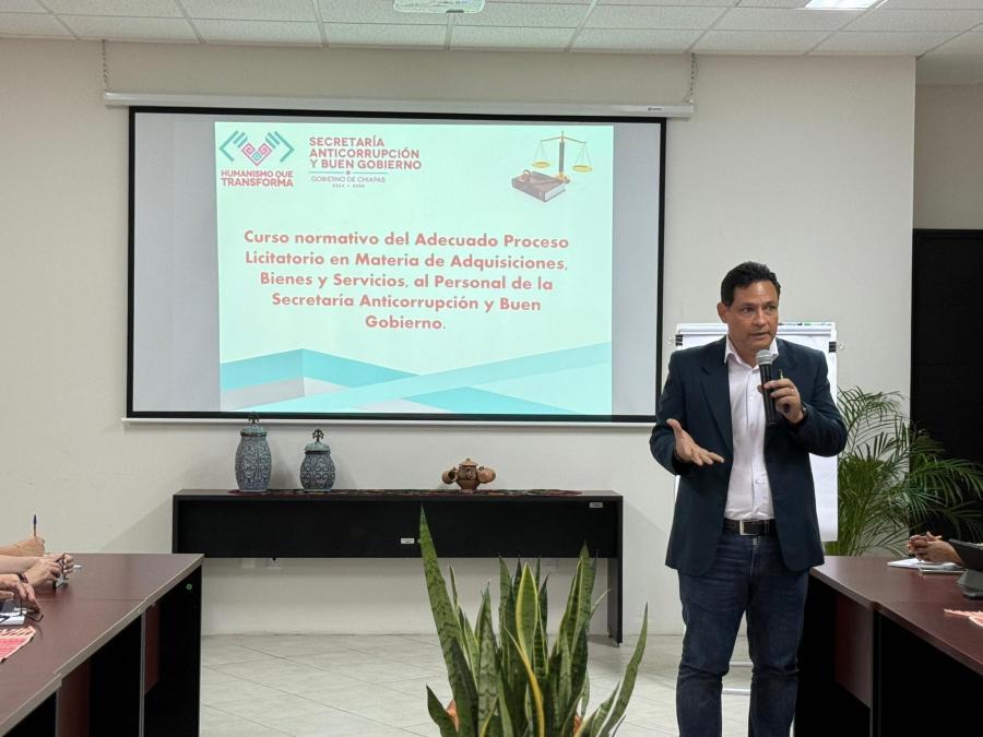 Tuxtla Gutiérrez, Chiapas.– Con el propósito de fortalecer las capacidades técnicas y promover la correcta aplicación de la normatividad en los procedimientos administrativos, se llevó a cabo el curso normativo sobre el adecuado proceso licitatorio en materia de adquisiciones, bienes y servicios, dirigido al personal de la Secretaría de Anticorrupción y Buen Gobierno.